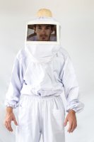 Conjunto em brim na cor branca com chapéu de palha e máscara acoplada em nylon .Tamanho único.
